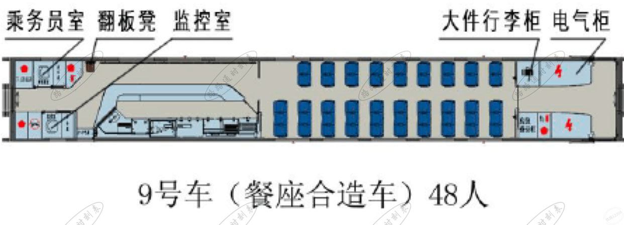 | 9号车(二等座车/餐车) 定员48人 拖车 |